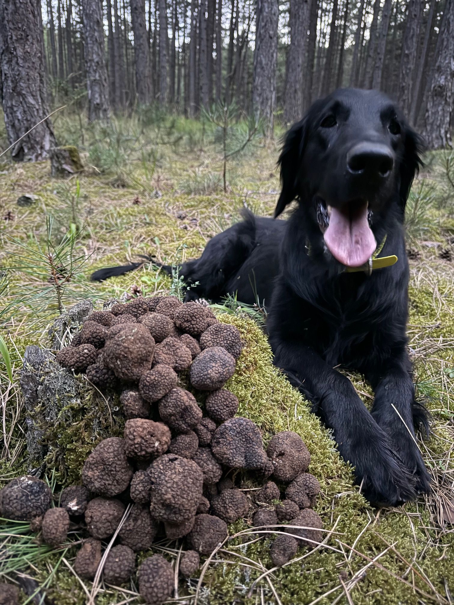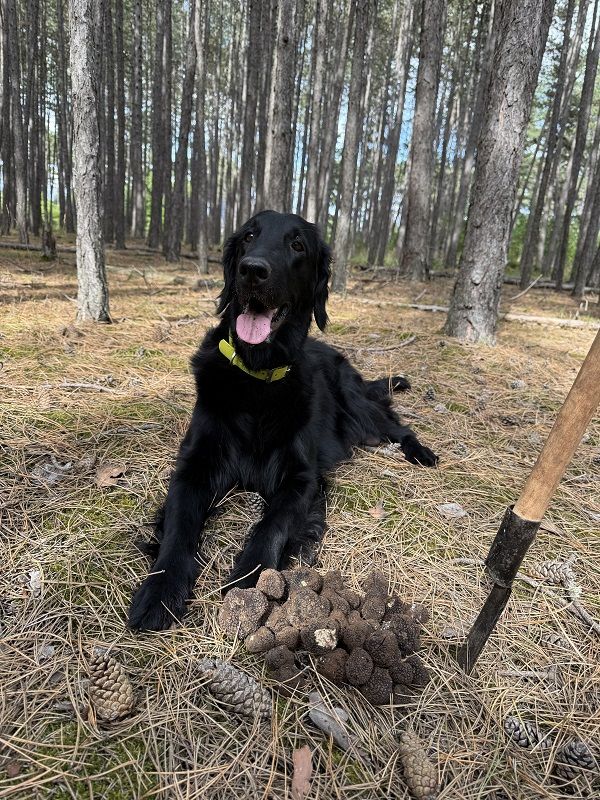 Alma cute as Mum my Mountain Fellow alias "Alma": Unsere erfahrene Flat Coated Retriever Hündin aus eigener Zucht ist eine wahre Trüffel-Koryphäe und hochdekorierte Profi-Sucherin! Alma stand bereits zweimal auf dem Podest beim Österreichischen Trüffel Workingtest – sie findet das schwarze Gold – also Schwarze Trüffel zielsicher.